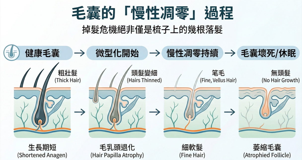 掉髮危機絕非僅是梳子上的幾根落髮,它是一場毛囊的「慢性凋零」過程。當您發現洗澡時排水孔經常堵塞、在強光下頭皮隱約可見、或是髮際線悄悄後退導致視覺年齡顯老,這代表毛囊正在發出求救訊號。