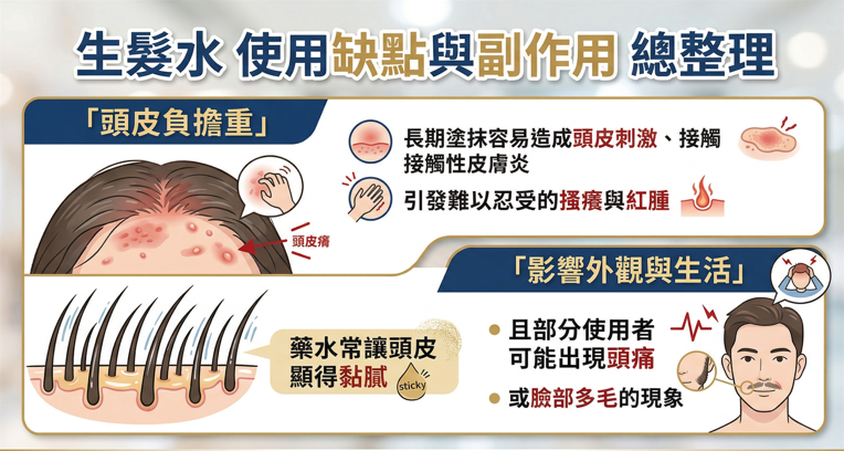 - 影響外觀與生活:藥水常讓頭皮顯得黏膩,且部分使用者可能出現頭痛或臉部多毛的現象 。