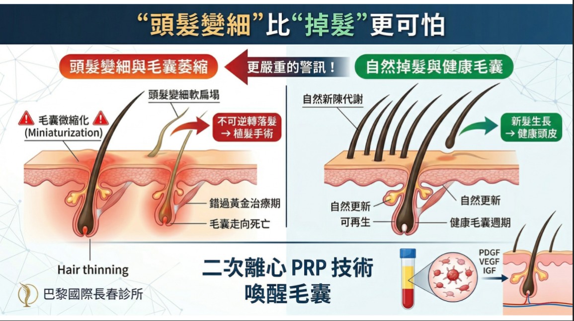 錯過黃金期,將面臨不可逆的「毛囊死亡」: 頭髮變細代表您的毛囊正處於缺乏營養、慢性發炎萎縮的狀態。如果在此時置之不理,毛囊最終會完全閉合、走向死亡。一旦毛囊死亡,任何治療都將無力回天,因為已經沒有「種子」可以發芽。