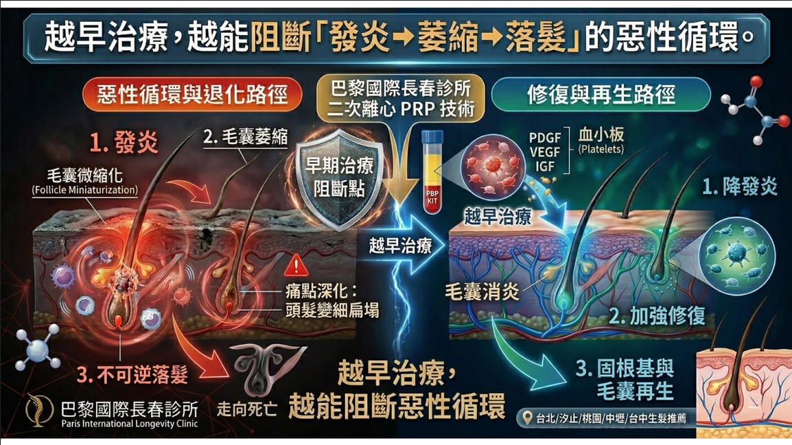 越早治療,越能阻斷「發炎➔萎縮➔落髮」的惡性循環。隨後頭皮環境將逐漸獲得改善。相對於無效的低價治療或昂貴的手術風險,這是一項對生活品質的高效率投資。