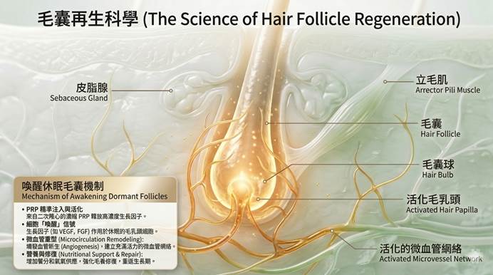 | 生長期 (Anagen) | 活躍生長 | 毛囊活性最強,頭髮持續變長、變粗 。 | 透過二次離心 PRP 提供高濃度生長因子,延長此階段並加強髮徑 。 |