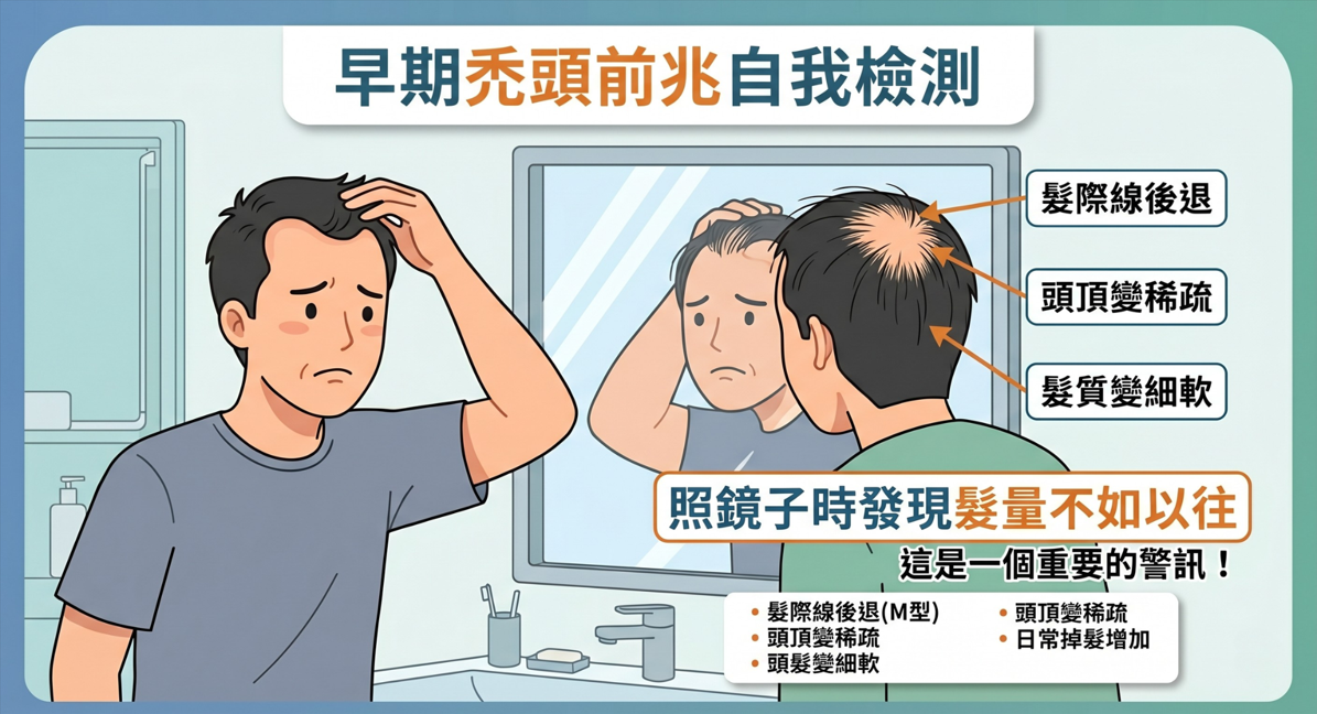 頭頂髮量變稀疏: 無論男女,若發現頭頂(髮旋處)逐漸稀疏,甚至在燈光下頭皮明顯透光,需特別留意 。