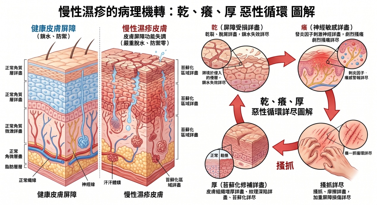 - 癢(神經敏感): 發炎因子持續刺激末梢神經,引發劇烈搔癢。這會誘發「癢—抓循環(Itch-Scratch Cycle)」,越抓發炎越重,越發炎越癢。