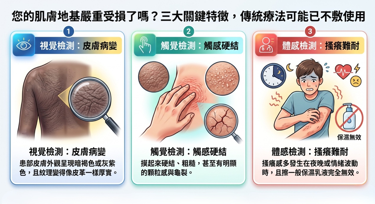 若您的患部出現以下三項特徵,代表肌膚地基已嚴重受損,傳統壓制療法可能已不敷使用: