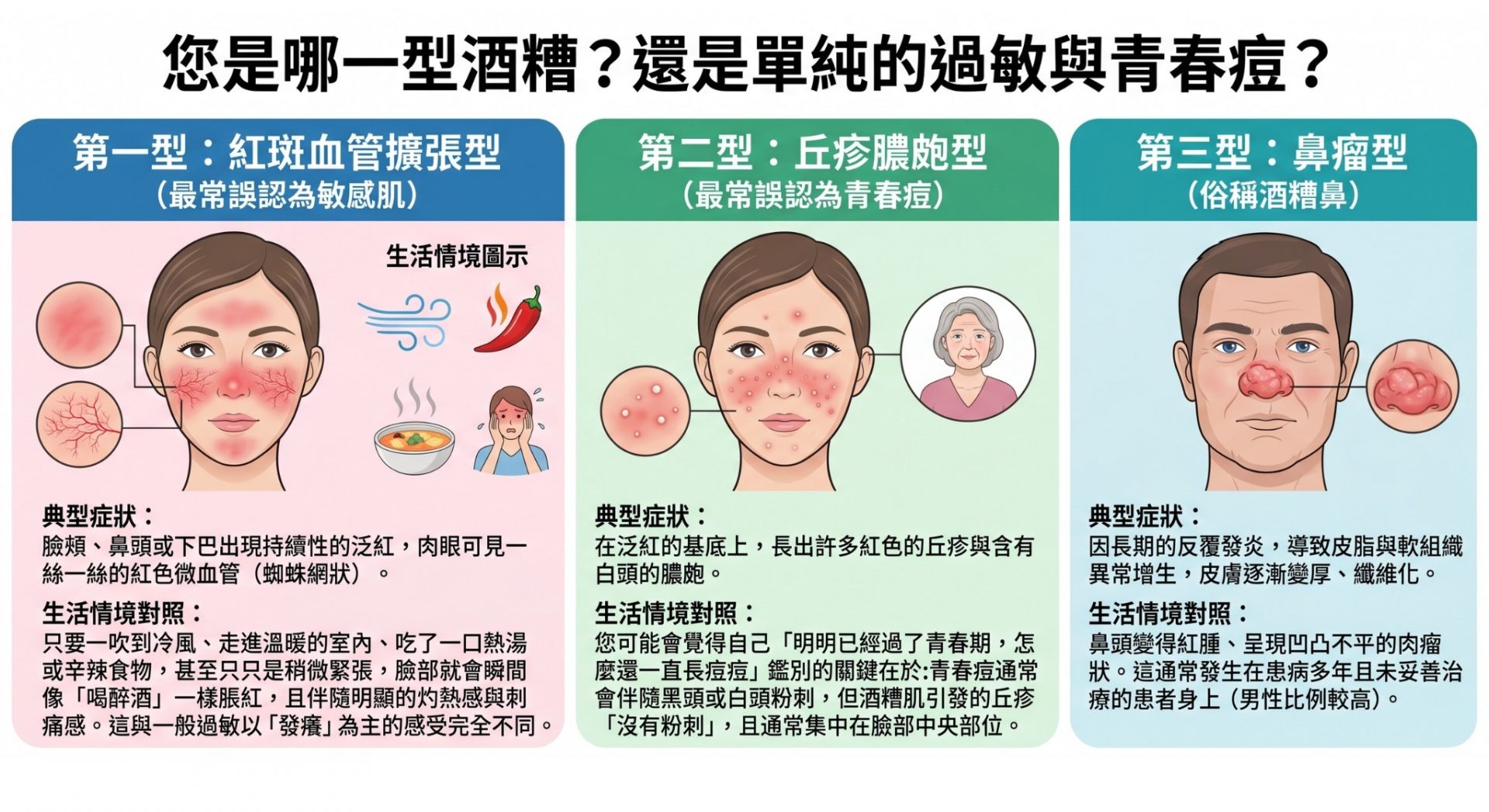 酒糟性皮膚炎(Rosacea,又稱玫瑰斑)是一種涵蓋神經血管失調與免疫異常的綜合型慢性皮膚發炎。許多患者在發病初期,常將其誤認為一般的換季過敏、異位性皮膚炎或青春痘,導致延誤了黃金重建期。為了幫助大家及早釐清膚況,鄧翔駿醫師根據多年的臨床經驗,整理出以下四種常見的酒糟型態。您可以透過這些具體的生活情境,進行【自我對照檢測】: