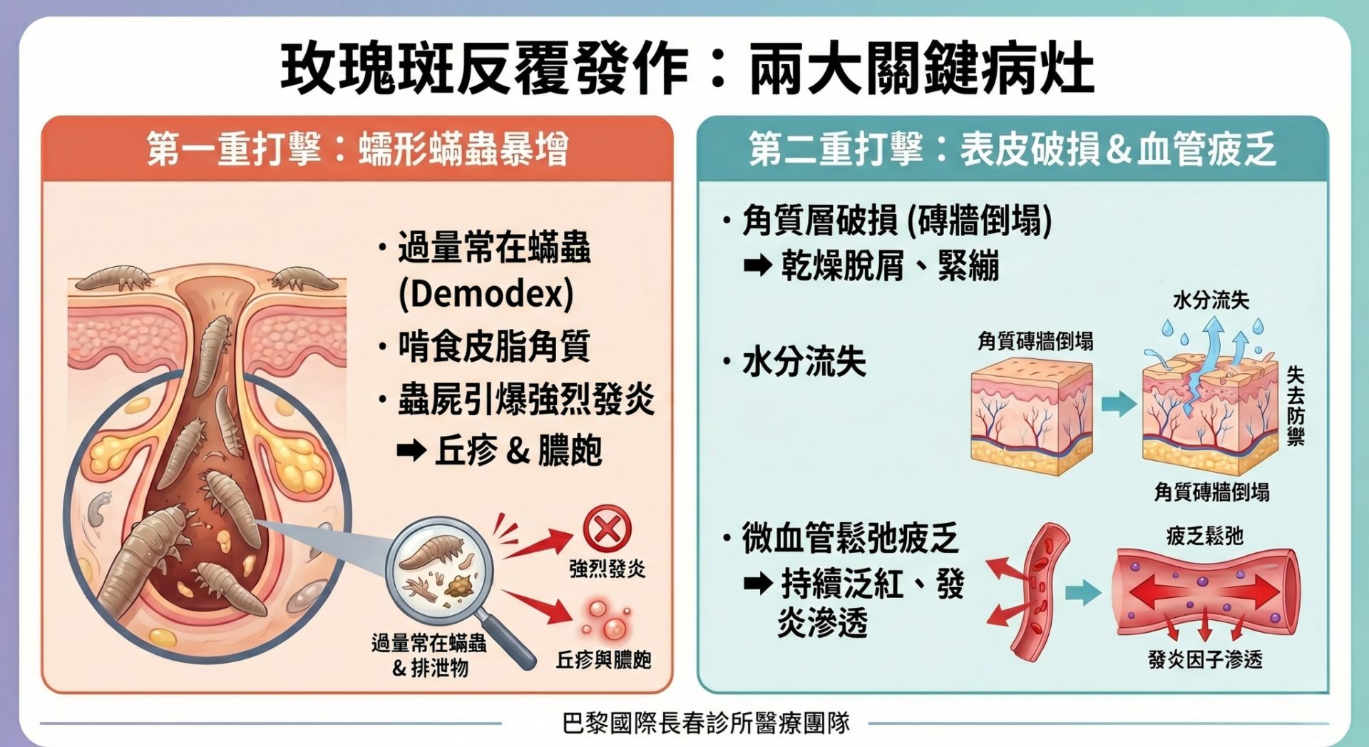 第二重打擊:表皮屏障破口與微血管疲乏(根本原因) 蟲蟲危機只是引爆點,真正的災難在於肌膚防禦力的全面崩盤。先天體質的脆弱,加上後天反覆的發炎(無論是因為蟎蟲、紫外線還是不當的雷射保養),會導致: