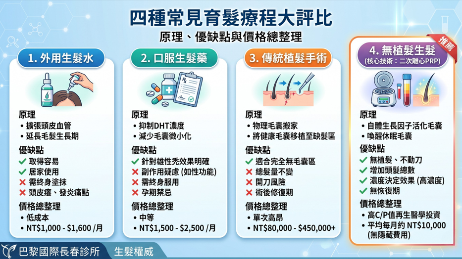 | 二次離心 PRP | 注入高濃度自體生長因子,活化毛囊 | 無植髮、不動刀、增加總髮量 | 毛囊若完全壞死則不適用 | 高 C/P 值再生醫學投資 |