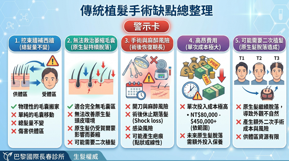 | 傳統植髮手術 | 將後枕部毛囊「搬家」到缺髮區 | 適合完全無毛囊區 | 總髮量不變、具開刀風險與修復期 | 高昂 |